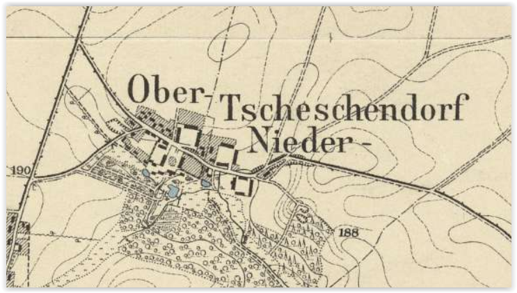 Wieś położona w gminie Złotoryja powiatu złotoryjskiego. Po raz pierwszy wzmiankowana w 1300 roku(Czeskindorf). W 1623 roku wieś należy do rodziny von Geisler. W 1626 roku wieś należała do rodu von Zedlitz. W 1650 własność rodu von Baudiss(Baudissin). W 1704 roku należy do rodziny von Birckholtz. W 1789 roku w części górnej mowa o siedzibie dworskiej, folwarku należące do rodziny von Hofmann. Część dolna składała się z dwóch majątków i folwarków należących do rodziny Hapel. W 1845 roku część Górna składała się z z dwóch części należące do kupca Wilhelma Geier i radcy karnego Kaulfuss. Dolna część składała się z dwóch części należących do braci: Wilhelma Hapel i Juliusa Hapel. W 1886 roku część górna należała do spadkobierców rodziny Geier i obejmował 152ha a część dolna podzielona na część górną, która należała do Emila Hapel i obejmowała 74 ha a część dolna należała do Rudolfa Hapel i obejmowała 66 ha. W 1894 roku część górna należała do Christopha Geier i obejmowała 166ha, a część dolna składająca się z dwóch części i część górna należała do Otto Grau i obejmowała 74ha a część dolna należała do Rudolfa Hapel i obejmowała 74ha. W 1898 roku część górna należała do Christopha Geier i obejmowała 167ha a część dolna podzielona na część górną należącą do Gustava Faulwasser i obejmowała 74ha a część dolna należała do Rudolfa Hapel i obejmowała 74ha. W 1902 roku majątek górny należał do Christopha Geier i obejmował 167ha, a część dolna podzielona część górną należącą do Gustava Faulwasser i obejmował 74ha a część dolna należąca do Rudolfa Hapel o obejmowała 74ha. W 1905 roku część górna należała do wdowy Anny Geier, z domu Vober i obejmował 167ha a część dolna składająca się z dwóch części, część górna należała do Gustava Faulwasser i obejmowała 74,7ha a część dolna należała do Rudolfa Hapel i obejmowała 66ha. W 1909 roku część górna należała do Ernsta Lommel i obejmowała 167ha, a część dolna podzielona na dwie części gdzie część górna należała do Gustava Faulwasser i obejmowała 74,7ha a część dolna należała do Rudolfa Hapel i obejmowała 66 ha. Jak podaje Spis rodzina Hapel siedziała tu od 300 lat. W 1917 roku część górna należała do Ernst Lommel i obejmował 167ha, a część dolna składająca się wcześniej z dwóch części została połączona w jeden majątek należący do Gustava Faulwasser i obejmowała 139,5ha. W 1921 roku część górna należała do Ernsta Lommel i obejmowała 167ha a dzierżawcą był Gustav Carl. Część dolna należała do Arno Eydam i obejmowała 139,5ha. W 1930 roku majątek w części górnej należał do Ernsta Lommel i obejmował 167ha a w części dolnej należał do Arno Eydam i obejmował 141ha. W 1937 roku część górna należała do Ernsta Lommel i obejmowała 167ha a część dolna należała do Arno Eydam i obejmowała 141ha.