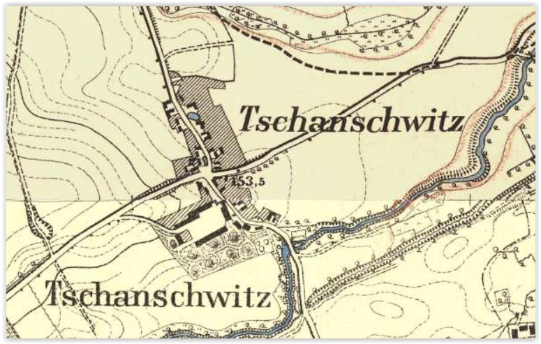 Wieś położona w gminie Strzelin powiatu strzelińskiego. Po raz pierwszy wzmiankowana w 1305 roku(Czanschicz). W 1700 i 1750 wieś należała do rodziny von Vippach. W 1744-1814 majątek należał z przerwami do baronów von Richthofen. W 1750 roku dobra należały do rodziny von Prittwitz h. Wczele. W 1757 roku dobra zakupił baron Gustav Wilhelm von Richthofen dla syna, barona Ernsta Wilhelma Praetoriusa od Georga Friedricha von Wentzky. W 1763 roku odkupiony majątek baron Wilhelm von Richthofen sprzedał Georgowi Juliusowi von Prittwitz-Lorzendorf. Po śmierci Georga Juliusa von Prittwitz, wdowa po powtórnym wyjściu za mąż za kapitana barona von Beneckendorf, zapisała majątek swojemu zięciowi baronowi Gottliebowi Ferdinandowi Konradowi von Richthofen w 1774 roku, który w 1770 roku ożenił się z Wilhelmine Juliane Charlotte von Prittwitz(12.02.1749), córką Georga Juliusa von Prittwitz. Miał z nią pięcioro dzieci: dwóch synów zmarło w dzieciństwie, dwie córki: Friederike zmarłą w wieku 9 lat, Johannę Luisę Ferdinande ur. 1777 i syna Samuela Friedricha Wilhelma Gottlieba(ur. 1781). W 1779 roku ponownie dobra należały do rodziny von Prittwitz h. Wczele. Przyrodnia siostra Gottlieba Ferdinanda Konrada w 1788 roku wyszła za mąż za Ernsta Bernharda Ferdinanda von Studnitz i prawd. w tym samym roku sprzedał mu wieś. Do 1804 roku właścicielem dóbr był von Mutius, od którego w tym roku majątek odkupił baron Wilhelm von Rischthofen. Z powodu zniszczeń majątków należących do barona Wilhelma podczas działań wojennych prusko-francuskich i z tym związanych późniejszych kłopotów finansowych sprzedał majątek baronowi von Kӧckritz. W 1813 roku majątek zakupił Ernst Heinrich von Mechau. W 1830-1845 majątek należał do rodziny von Kockow. W 1845 roku dobra zakupił Christian Zirpel. W 1876 roku majątek należał do Alberta Rosenthal. W 1886 roku majątek o areale 230ha należał do Benno Margwald. W 1894 dobra o powierzchni 230 ha należały do Benno Marckwald(Margwald). W 1898 majątek posiadał baron Karl von Richthofen-Damsdorf i obejmował 142ha. W 1902 roku majątek o areale 141,5ha należały do Benno Markwald(Marckwald, Margwald). W 1905 i w 1909 roku dobra ponownie w rękach barona Karla von Richthofen a dobra obejmowały 142ha. W 1917 roku majątek w rękach wdowy Hildegardy Brossling a dobra obejmowały 232ha. W 1921 i w 1926 roku dobra w rękach spadkobierców po Dr Fritzu Brossling a majątek obejmował 232ha. Dzierżawcą był Bern. Rother. W 1937 roku majątek należał do Hansa Joachima Brӧssling i obejmował 232 ha a dzierżawcą był Bern. Rother.